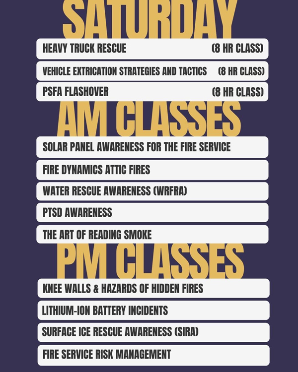 Join us for two days of hands-on fire service training with experienced instructors and a full lineup of courses designed to sharpen skills and build knowledge for today’s fire service.